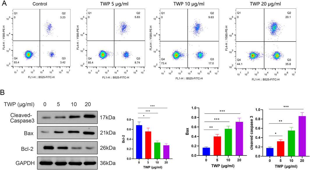 Figure 10. TWP dose-dependently induces apoptosis in A2780/DDP cells. (A) Representative dot plots and quantitative summary of Annexin V-FITC/PI staining; quadrants Q1-Q4 denote debris, late-apoptotic, early-apoptotic and viable cells, respectively. (B) Western blot and densitometry of Bcl-2, Bax and cleaved Caspase-3. GAPDH served as loading control. Data are presented as mean ± SD. *P < 0.05, **P < 0.01, ***P < 0.001 by ANOVA with Tukey post hoc test.