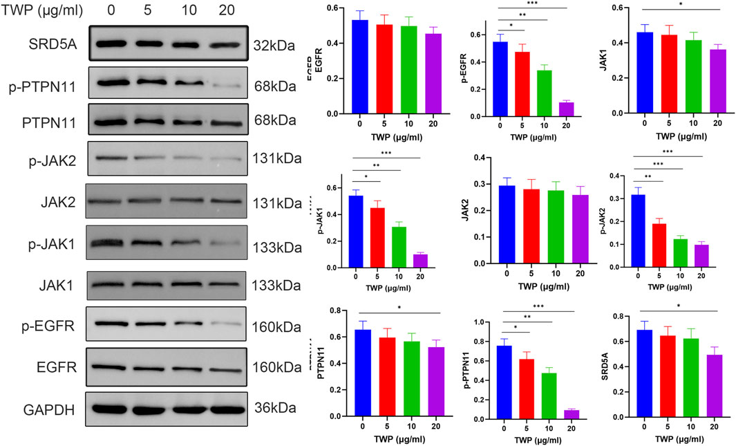 To verify the network-pharmacology predictions, A2780/DDP cells were treated with TWP (0–20 μg/mL) for 24 h and analyzed by Western blot analysis. As shown in Figure 11, TWP produced a concentration-dependent reduction in the phosphorylated forms of EGFR, JAK1, JAK2 and PTPN11; significant inhibition was evident at 5 μg/mL and maximal at 20 μg/mL (P < 0.001). Total EGFR and JAK2 levels remained unchanged, whereas total JAK1 and PTPN11 were modestly decreased only at 20 μg/mL (P < 0.05). SRD5A1 expression declined markedly at the same dose (P < 0.05). These results demonstrate that TWP primarily inactivates upstream kinases/phosphatases through de-phosphorylation, with secondary downregulation of select targets at higher concentrations, thereby disrupting multiple pro-growth circuits in cisplatin-resistant ovarian cancer cells.