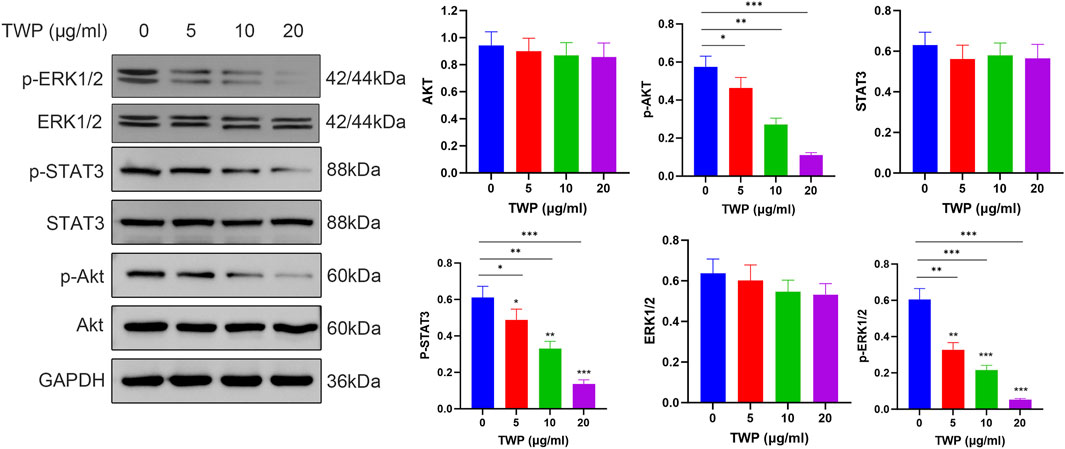 Figure 12. TWP inhibits phosphorylation of Akt, STAT3, and ERK1/2 in A2780/DDP cells. Left panel: Representative western blots showing the effects of TWP (0, 5, 10, 20 μg/mL) on the phosphorylation and total protein levels of Akt, STAT3, and ERK1/2 in A2780/DDP cells. Molecular weights (kDa) are indicated. Right panels: Quantitative analysis of protein levels normalized to GAPDH. Data are presented as mean ± SD. *P < 0.05, **P < 0.01, ***P < 0.001 by ANOVA with Tukey post hoc test.