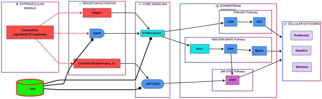 As illustrated in the comprehensive signaling diagram (Figure 13), our findings paint a cohesive picture. TWP alkaloids act as inhibitors at the receptor and signal integration level, targeting EGFR, JAK1/2, and the pivotal phosphatase PTPN11/SHP2. This action blocks signals emanating from growth factors (e.g., EGF) and cytokines (e.g., IL-6), leading to the simultaneous shutdown of three distinct but interconnected oncogenic cascades: the JAK-STAT pathway, the Ras-ERK-MAPK pathway, and the PI3K-AKT pathway. The ultimate result is the inhibition of key malignant phenotypes, including proliferation and stemness, and the induction of apoptosis, thereby restoring cisplatin sensitivity.