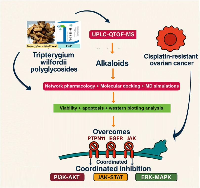 To bridge this critical knowledge gap, we employed a multi-dimensional integrative approach combining UPLC/Q-TOF-MS phytochemical profiling, network pharmacology, microarray-based transcriptomic analysis, and advanced molecular modeling techniques. This strategy enabled systematic deconvolution of TWP’s chemical composition, identification of its bioactive constituents, prediction of therapeutic targets, and validation of their clinical relevance in ovarian cancer pathogenesis. Based on our initial objective to investigate the under explored components of TWP, our findings compellingly demonstrate that alkaloids, far from being secondary players, constitute a primary class of active components driving TWP’s anti-ovarian cancer effects. This was evidenced by their superior efficacy in targeting key chemoresistance pathways in our network pharmacology models. Through integrated network analysis and clinical transcriptomic data, we identified five core targets (EGFR, JAK1, JAK2, PTPN11, and SRD5A1) that are differentially expressed in ovarian cancer tissues and serve as central nodes in TWP’s mechanism of action. Subsequent molecular docking and dynamics simulations confirmed stable, high-affinity binding between TWP alkaloids and these targets, providing structural insights into their interactions. Crucially, experimental validation demonstrated that TWP simultaneously modulates these targets to coordinately suppress PI3K-AKT, JAK-STAT, and ERK-MAPK signaling pathways, thereby inducing apoptosis and overcoming cisplatin resistance in ovarian cancer cells.