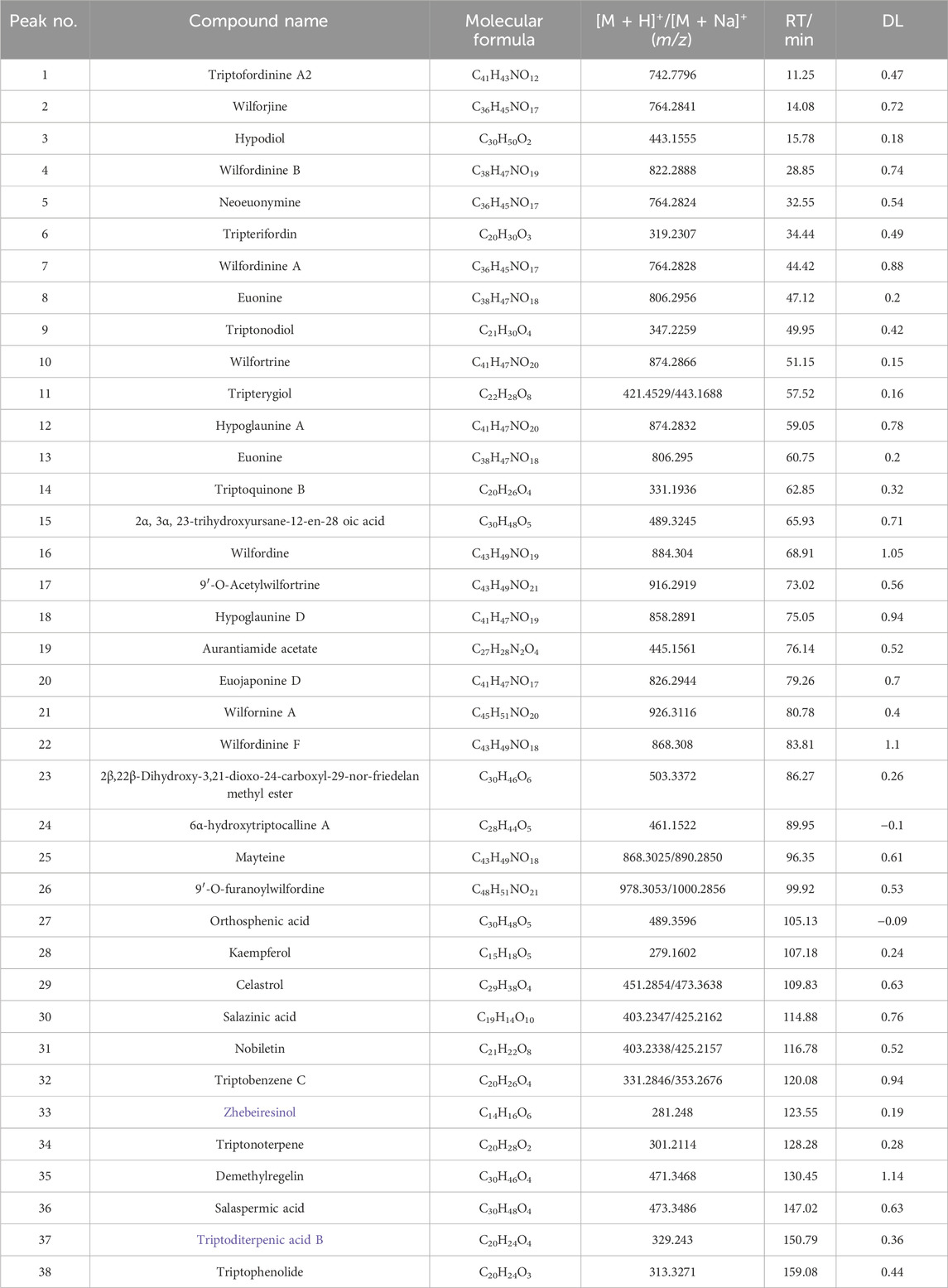 A Tripterygium database was compiled from CNKI, Wanfang, PubMed, Web of Science, SciFinder, and Reaxys. Constituents were annotated by accurate mass, MS/MS fragmentation, and retention time, and confirmed against reference standards when available. Molecular formulae were inferred from exact mass and isotopic patterns. Compounds were classified as alkaloids, diterpenoids, triterpenoids, or other.
