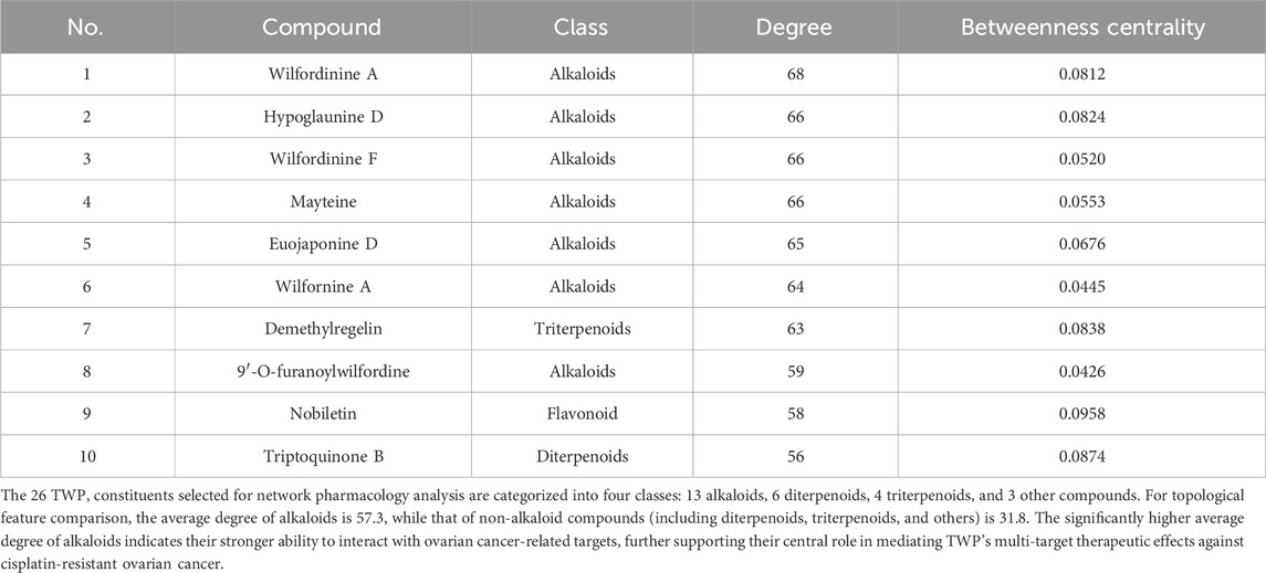 A compound-target network was constructed to visualize interactions between TWP constituents and their predicted targets. The bipartite network (Figure 2B) comprised 268 nodes (26 compounds, 242 targets) and 1,274 edges, reflecting TWP’s multi-component, multi-target pharmacology. Topological analysis identified highly connected compounds, likely representing key pharmacologically active constituents. The top 10 compounds by degree (Table 2) were predominantly alkaloids (e.g., wilfordinine A, wilforidine, wilfornine A, wilfortrine, euojaponine D), consistent with chemical profiling and suggesting alkaloids as primary mediators of TWP’s anti-ovarian cancer effects.