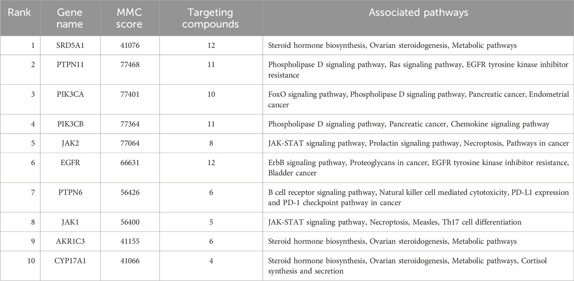 Table 3. Top 10 hub genes in the PPI network: functional annotations, targeting compounds, and pathway associations.