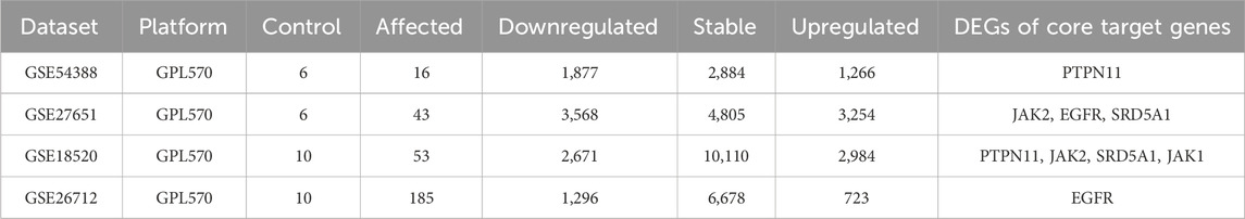 Four independent ovarian cancer microarray datasets (GSE18520, GSE26712, GSE27651, GSE54388) were analyzed to validate the clinical relevance of hub genes. Differentially expressed genes (DEGs) were identified using stringent criteria (adjusted p < 0.05, |log2(FC)|≥1), and volcano plots were generated to visualize the distribution of gene expression changes (Figure 5). The analysis revealed substantial transcriptional alterations across datasets, with 723–3,254 upregulated and 1,296–3,568 downregulated genes per dataset. Among the top 10 hub genes, five core targets (PTPN11, JAK2, EGFR, SRD5A1, and JAK1) demonstrated consistent differential expression in ≥2 datasets (Table 4). These five genes, which demonstrated both network centrality and differential expression in clinical samples, were designated as core targets for subsequent molecular docking analysis. Their differential expression patterns in ovarian cancer tissues suggest potential roles in disease pathogenesis and progression, further supporting their relevance as therapeutic targets for TWP.