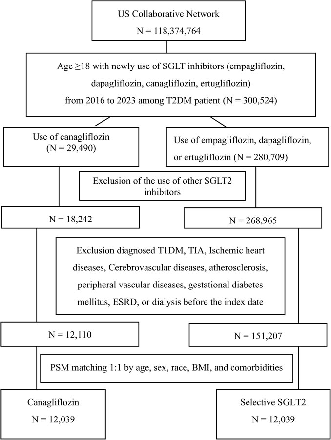 Given the observational design, we used PSM to balance baseline characteristics between the two groups and mitigate confounding. The propensity score was estimated using a logistic regression model predicting the probability of receiving canagliflozin (versus other selective SGLT2 inhibitor) given baseline covariates. Covariates included demographics, baseline body mass index (BMI), baseline estimated glomerular filtration rate (eGFR), concurrent medications, and comorbidities. Each canagliflozin user was matched to one selective SGLT2 user with a similar propensity score using 1:1 nearest-neighbor matching without replacement (caliper = 0.1). Successful matching was confirmed by standardized mean differences (SMD) < 0.1 for all covariates, indicating negligible residual imbalance. After matching, the final analysis cohort consisted of 12,039 canagliflozin users and 12,039 other SGLT2 users. The cohort flow is illustrated in Figure 1, which depicts the initial population, application of inclusion/exclusion criteria, and the matching process leading to the final analytical sample.