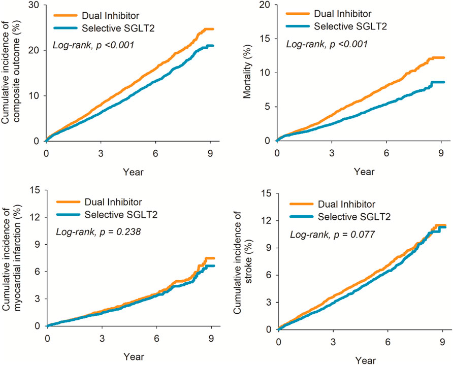 Conclusion: In this large real-world cohort, patients initiating canagliflozin had higher observed event rates for a composite of myocardial infarction, stroke, or all-cause mortality compared with those initiating selective SGLT2 inhibitors. These associations should be interpreted as exploratory and hypothesis-generating, given the observational design and differences from randomized trial evidence. Further research is needed to clarify potential differences among SGLT2 inhibitors in routine practice.