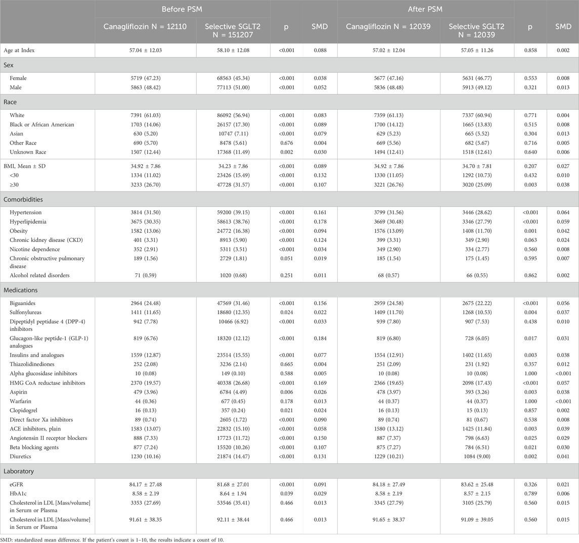 After applying inclusion and exclusion criteria and propensity matching, we analyzed 24,078 patients with T2DM, with 12,039 in the canagliflozin group and 12,039 in the selective SGLT2 inhibitor group (Table 1). The two groups had a mean age of 57 years, and 47% were female in each, reflecting successful matching. Racial composition was also similar: approximately 61% White, 14% Black, 5% Asian, and the remainder of other/unknown races. Mean baseline HbA1c was 8.6% in both groups, indicating moderately uncontrolled diabetes on average. Comorbid conditions and medication use were well-balanced post-matching (all standardized differences <0.1). For example, the prevalence of hypertension (31%), hyperlipidemia (30.5%), and chronic kidney disease (3.3%).