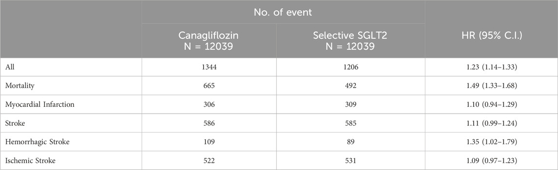 During follow-up, 1344 patients in the canagliflozin group and 1206 in the selective SGLT2 group experienced a primary outcome event, while 665 vs. 492 died from any cause (Table 2). The incidence of the composite outcome was significantly higher in patients initiating canagliflozin compared to those on selective SGLT2 inhibitors. The HR for MACE was 1.23 (95% CI 1.14–1.33) in the canagliflozin vs. selective group (p < 0.001). Figure 2 illustrates the Kaplan-Meier curves for the composite outcome, which began to diverge within the first year of therapy and continued to separate over time, favoring the selective SGLT2 group. MI risk did not differ significantly between groups: HR 1.10 (95% CI 0.94–1.29). Similarly, overall stroke (all strokes combined) occurred at a similar rate in both groups: HR 1.11 (0.99–1.24), a non-significant trend toward higher stroke in the dual inhibitor group. When strokes were categorized, ischemic stroke specifically was not significantly different (HR 1.09, 95% CI 0.97–1.23). In contrast, hemorrhagic stroke was notably more frequent in the canagliflozin group: 109 hemorrhagic strokes versus 89 in the selective group (out of 12,039 patients each), corresponding to HR 1.35 (95% CI 1.02–1.79).