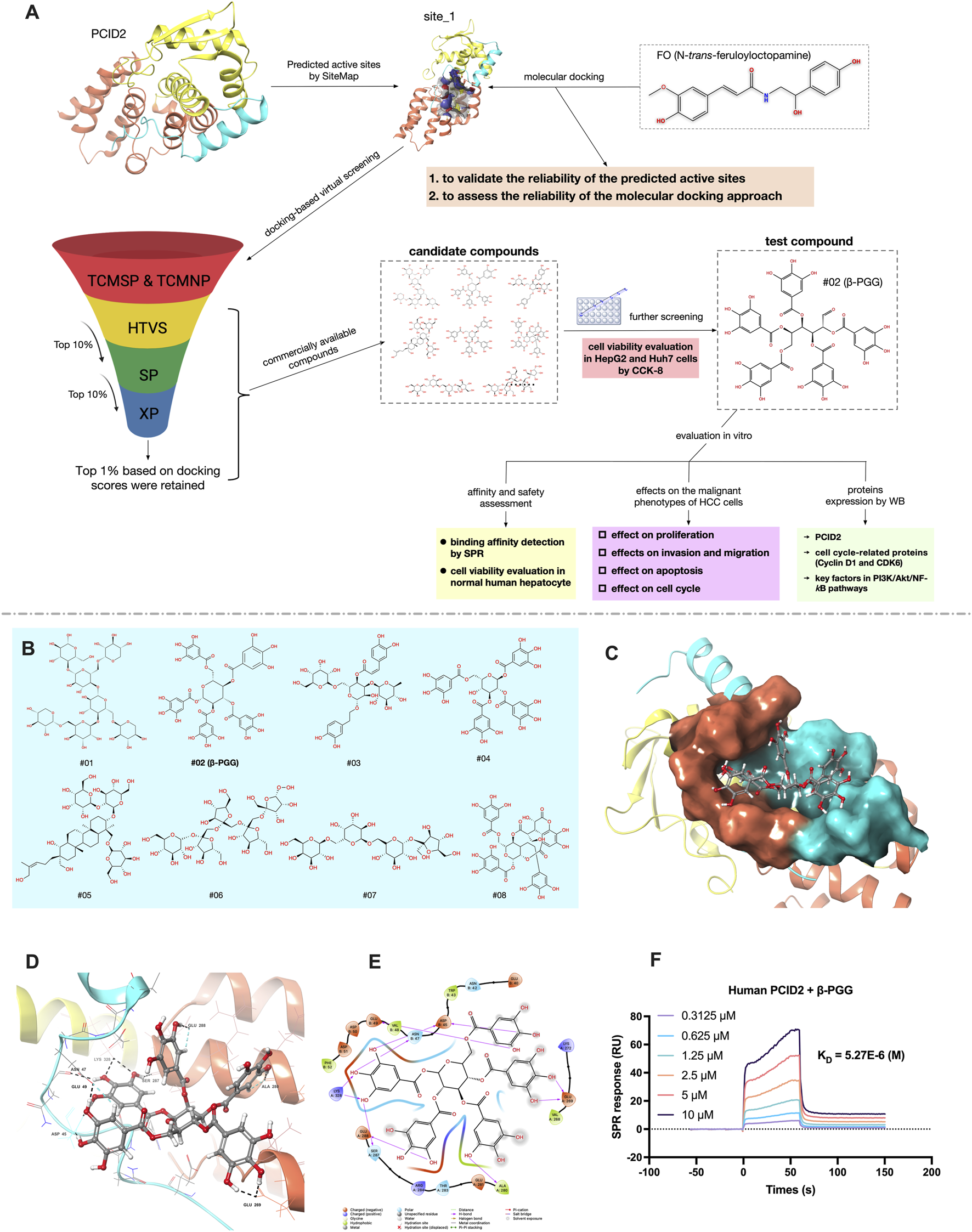 Figure 1. (A) Schematic diagram of the screening strategy for potential PCID2 inhibitors and activity evaluation workflow in this study. (B) The 2D structures of eight candidate compounds. (C) Surface representation of the compound #02 docked pose at the active site_1 of PCID2. Orange represents the superhelical domain of PCID2, and cyan represents the domain of DSS1. (D,E) Binding mode of the compound #02 in active sites (residues within 3 Å and 2D-interaction was shown). (F) The binding affinity between human PCID2 and varying concentrations of the compound #02 (β-PGG) was assessed by SPR, and the KD value were calculated.