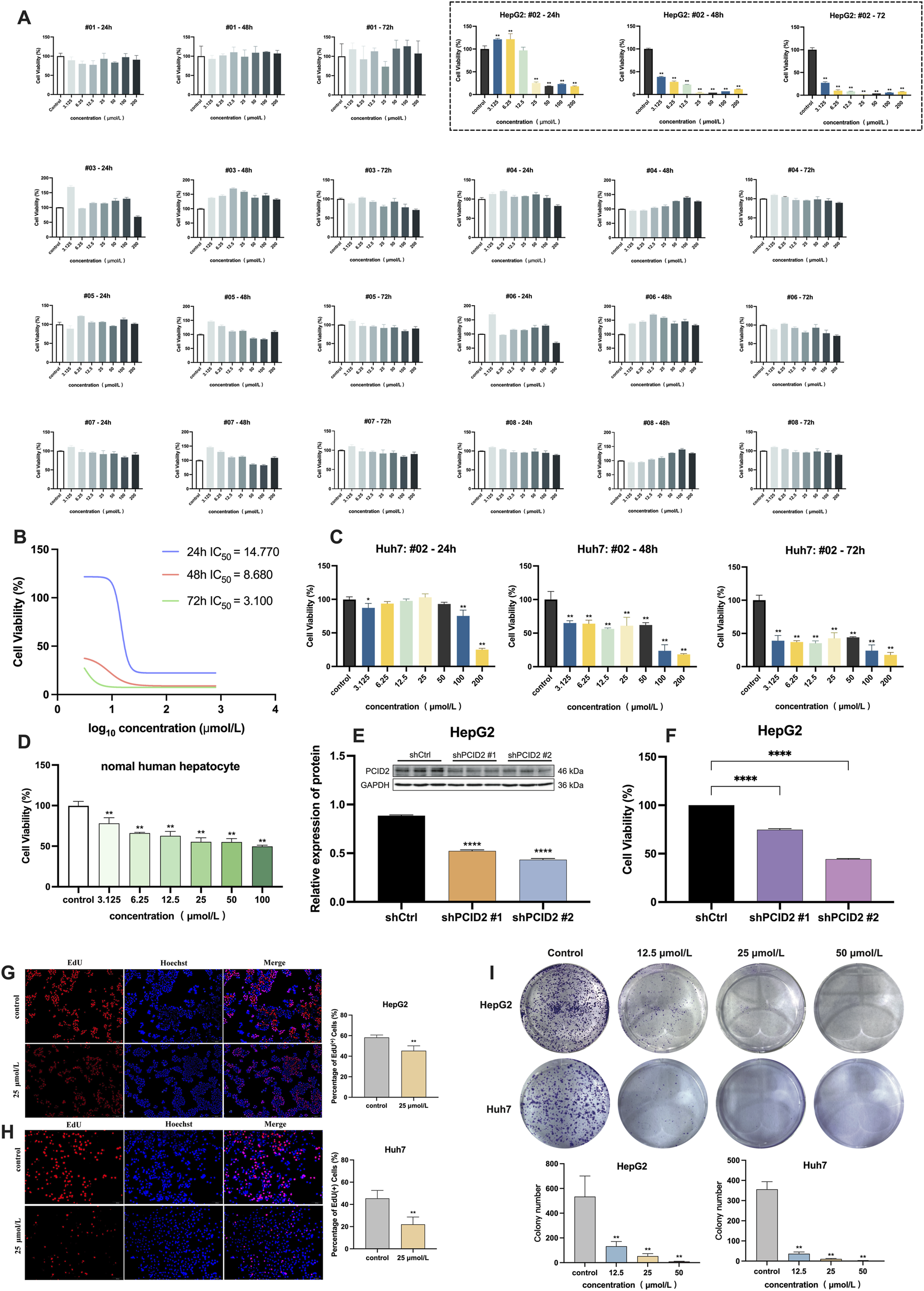 Figure 2. (A) Cell viability of HepG2 cells after 24, 48, and 72 h of treatment with eight candidate compounds by CCK-8 assay, and the dashed box displays the results for compound #02 (β-PGG). (B) IC50 values of the β-PGG on the viability of HepG2 cells. (C) Cell viability of Huh7 cells after 24, 48, and 72 h of treatment with β-PGG. (D) Cell viability of normal human hepatocytes after 24 h of treatment with β-PGG. (E) Validation of PCID2 knockdown efficiency using Western Blot assays. (F) Cell viability of PCID2 knockdown in HepG2 cells after 24 h; (G,H) Viability and proliferation of the HepG2 (G) and Huh7 (H) cells after β-PGG treatment by EdU assay (scale bar: 500 μm). (I) The colony formation assay was used to evaluate the effects of β-PGG on the clonogenic proliferation capacity of individual HepG2 and Huh7 cells. Data is expressed as mean ± SD (n = 3). *P < 0.05, **P < 0.01, ****P < 0.0001 indicate statistically significant differences compared to the control group.