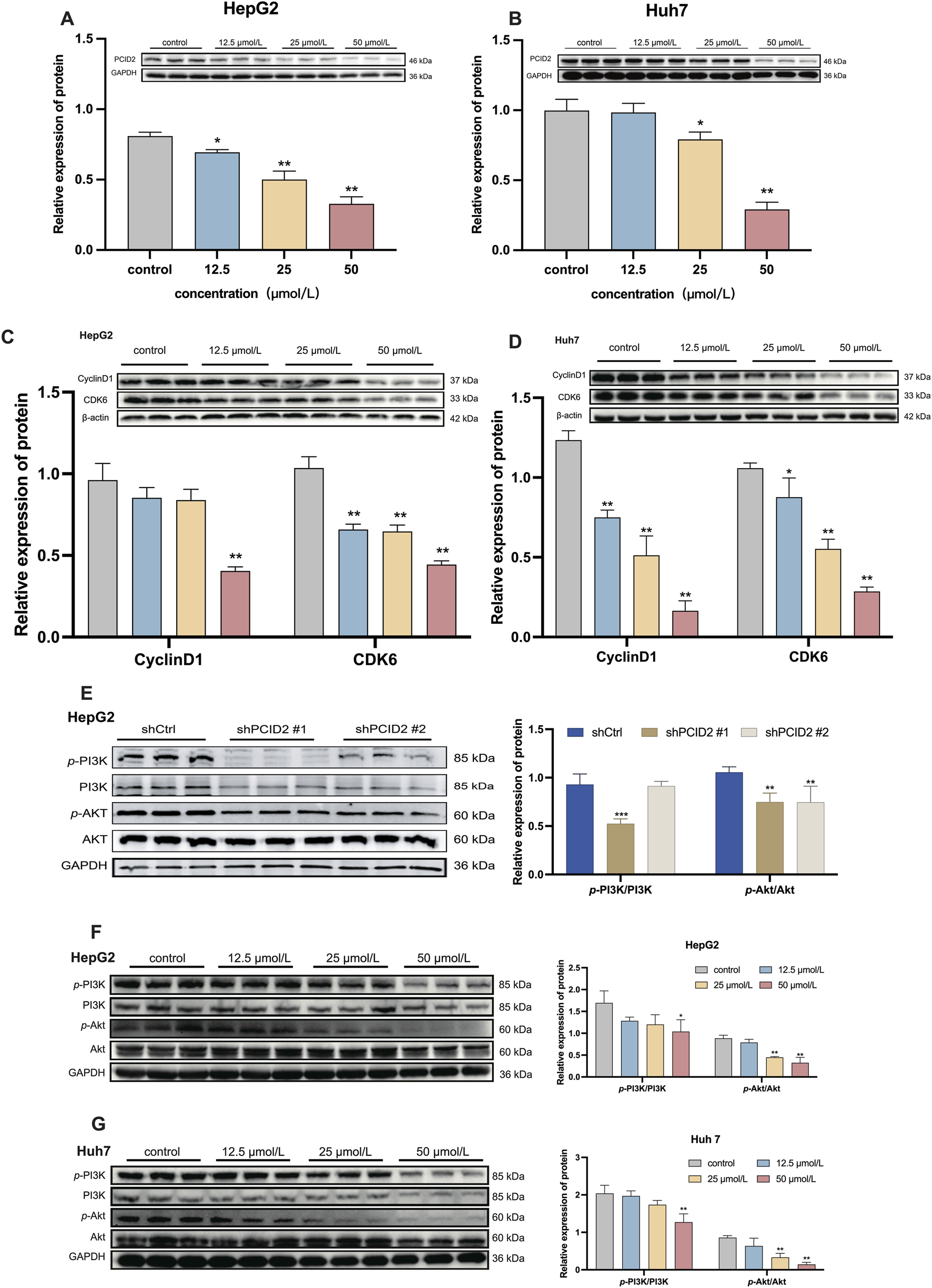 Figure 4. Western blot analysis of protein expression levels. (A,B) PCID2 expression in HepG2 (A) and Huh7 (B) cells. (C,D) Expression of the cell cycle-related proteins CyclinD1 and CDK6 in HepG2 (C) and Huh7 (D) cells following β-PGG treatment. (E) Expression levels of p-PI3K/PI3K and p-Akt/Akt in PCID2 knockdown HepG2 cells. (F,G) Expression levels of p-PI3K/PI3K and p-Akt/Akt in HepG2 (F) and Huh7 (G) cells following β-PGG treatment. Data is expressed as mena ±SD (n = 3). *P < 0.05, **P < 0.01, ***P < 0.001, and ****P < 0.0001 indicate statistically significant differences compared to the control group.