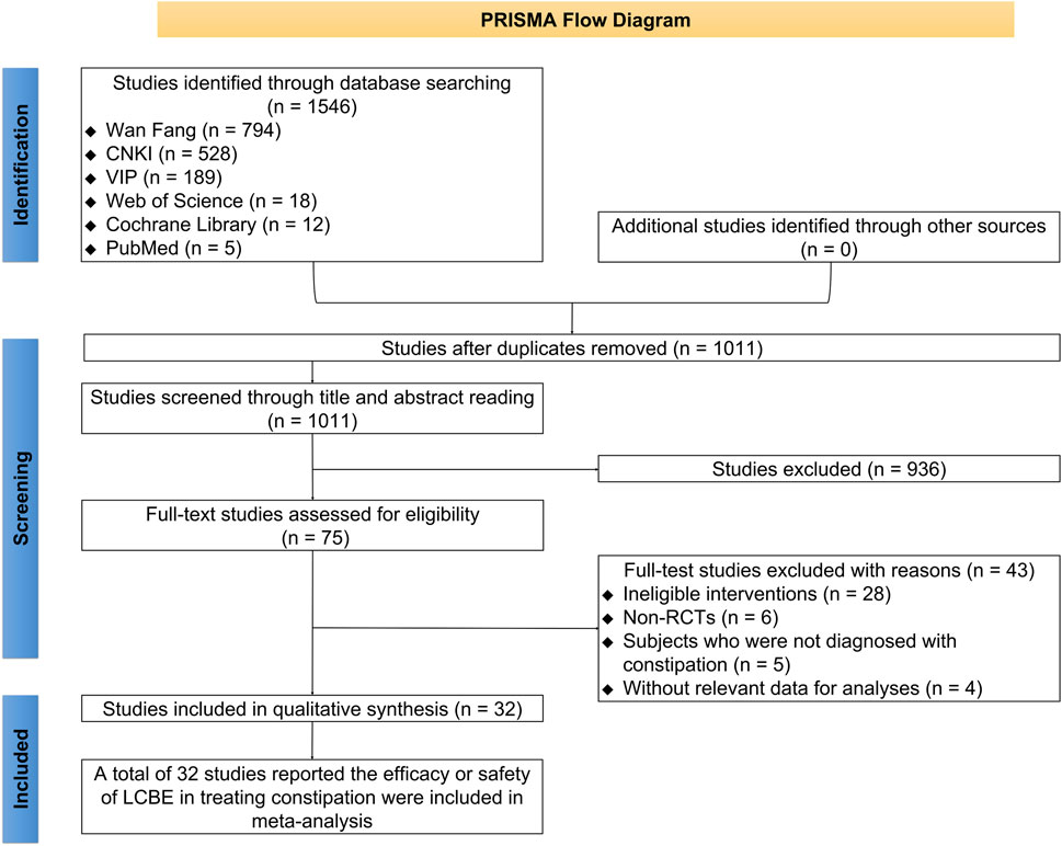 There were 1,502 studies identified through database searching, comprising 782 studies from Wan Fang, 499 from CNKI, 189 from VIP, 16 from Web of Science, 11 from Cochrane Library, and 5 from PubMed. Subsequently, 524 duplicated studies were removed. A total of 903 studies were excluded after screening titles and abstracts. Then, 43 studies were removed after full-text reading, comprising 28 studies with ineligible interventions, 6 non-RCTs, 5 studies whose subjects were not diagnosed with constipation, and 4 studies without relevant data for analysis. Eventually, 32 studies reporting the efficacy or safety of LCBE in treating constipation were included in this meta-analysis (Cao et al., 2012; Chen and Cui, 2014; Chen et al., 2013; Cheng and Liu, 2007; Deng and Huang, 2011; Fu and Huang, 2013; Ge et al., 2014; Guo, 2017; He et al., 2020; Huang et al., 2014; Kong and Zhou, 2015; Liang et al., 2016; Liang et al., 2019; Liu et al., 2013; Lv et al., 2017; Ma et al., 2013; Mao, 2013; Peng, 2014; Peng, 2016; Qi, 2018; Tang et al., 2009; Wang, 2020; Wu et al., 2012; Wu Q. F. et al., 2016; Wu X. L. et al., 2016; Yang, 1999; Yi, 2008; Zeng and Wei, 2022; Zhang, 2019; Zhang, 2016; Zhang et al., 2017; Zhong, 2001) (Figure 1).