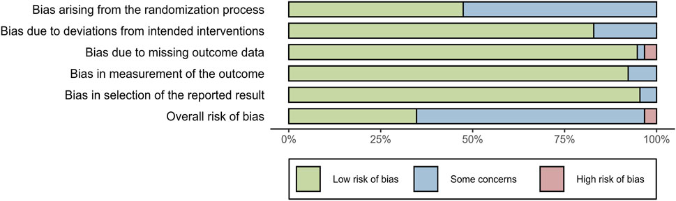 The quality of included studies was evaluated using the ROB 2.0 tool. For bias arising from the randomization process, 16 studies were assessed as “low risk of bias,” and the remaining 16 studies were evaluated as having “some concerns.” Regarding bias due to deviations from intended interventions, 26 studies were assessed as “low risk of bias,” and 6 studies were evaluated as having “some concerns.” For bias due to missing outcome data, 30 studies were assessed as “low risk of bias,” 1 study was evaluated as having “some concerns,” and 1 study was evaluated as “high risk of bias.” For bias in the measurement of the outcome, 29 studies were assessed as “low risk of bias,” and 3 studies were evaluated as having “some concerns.” For bias in the selection of the reported results, 30 studies were evaluated as “low risk of bias,” and 2 studies were evaluated as having “some concerns.” In terms of overall risk of bias, there were 10 studies assessed as “low risk of bias,” 21 studies evaluated as having “some concerns,” and 1 study categorized into “high risk of bias.” The above information indicated that the included studies were of moderate-to-high quality (Figure 2).