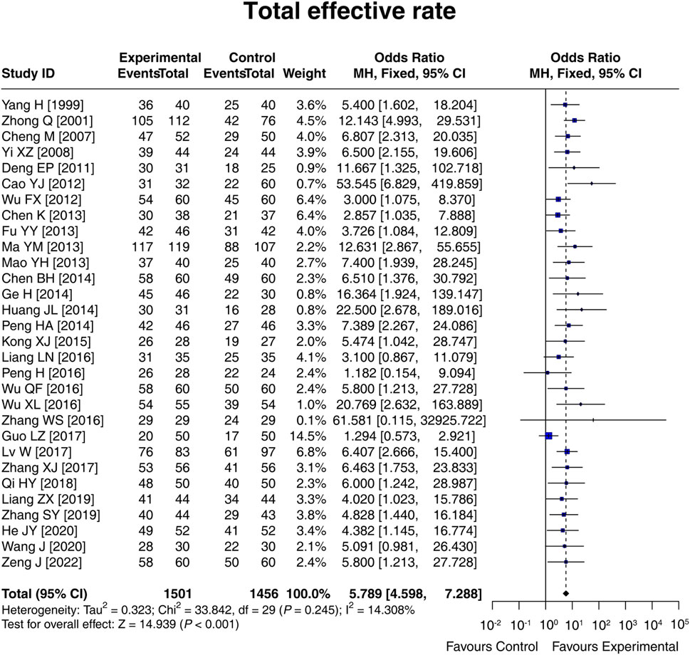 A total of 30 studies compared the total effective rate between the experimental and control groups, and there was no heterogeneity among these studies (I2 = 14.308%; p = 0.245). The fixed-effects model showed that the total effective rate in the experimental group was 5.789 times that in the control group [OR (95% CI): 5.789 (4.598, 7.288); p < 0.001] (Figure 3). Moreover, subgroup analysis based on the control intervention revealed that the total effective rate was higher in the experimental group than in the control group, regardless of whether the control intervention was conventional therapy [OR (95% CI): 6.774 (4.646, 9.876); p < 0.001], lactulose [OR (95% CI): 5.766 (3.983, 8.347); p < 0.001], or others [OR (95% CI): 4.563 (2.848, 7.311); p < 0.001] (Supplementary Figure S1). The result disclosed that LCBE elevated the total effective rate.