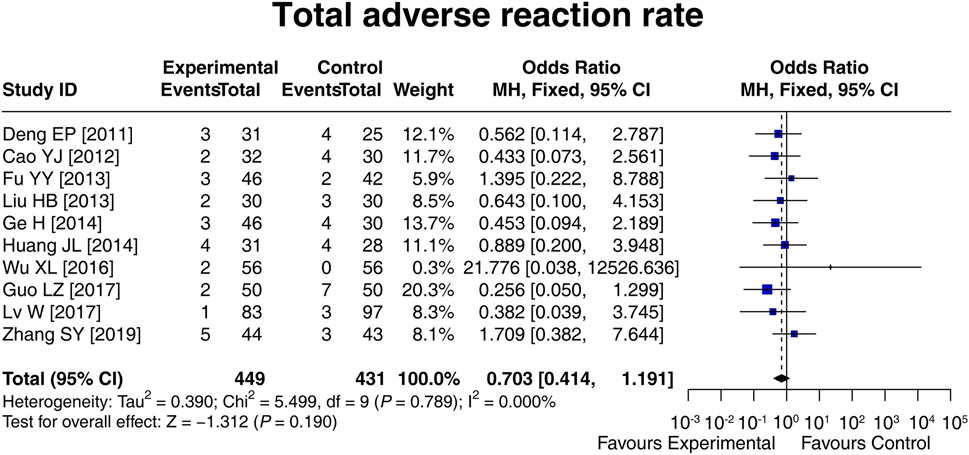 Ten studies compared the total adverse reaction rate between the experimental and control groups, and there was no heterogeneity among these studies (I2 = 0.000%; p = 0.789). Then, the fixed-effects model showed that there was no difference in the total adverse reaction rate between groups [OR (95% CI): 0.703 (0.414, 1.191); p = 0.190] (Figure 5). In addition, the specific adverse reaction, including diarrhea [OR (95% CI): 0.812 (0.356, 1.852); p = 0.620], nausea and vomiting [OR (95% CI): 0.971 (0.243, 3.891); p = 0.967], abdominal distension [OR (95% CI): 0.565 (0.199, 1.610); p = 0.286], and abdominal pain [OR (95% CI): 1.513 (0.257, 8.901); p = 0.647] were not different between the experimental and control groups (Supplementary Table S1). These results suggested that LCBE did not increase the risk of adverse reactions.