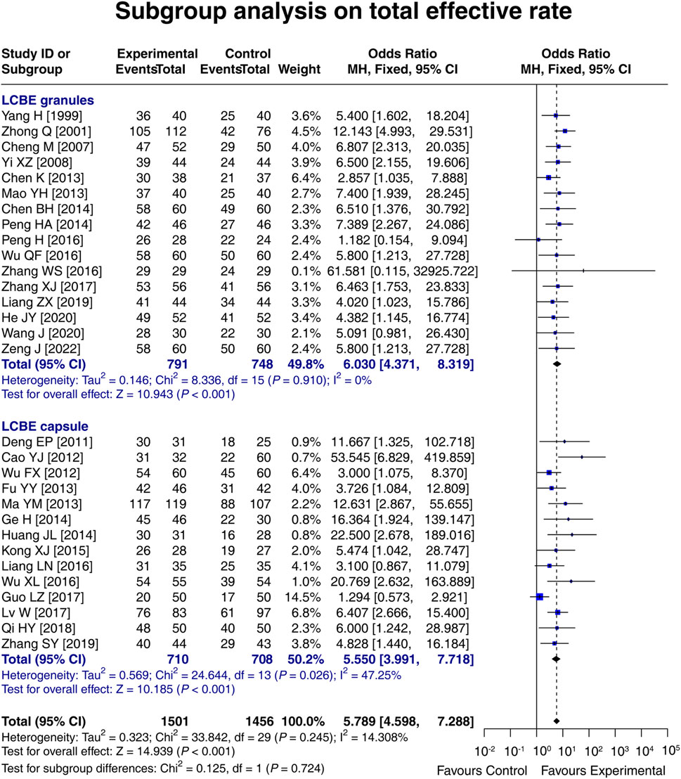 ![Forest plot illustrating the subgroup analysis on total effective rate for two treatments: LCBE granules and LCBE capsule. Each study's odds ratio, weight, and confidence interval are displayed. A vertical line separates favoring control from favoring experimental results. LCBE granules show an odds ratio of 6.030 [4.371, 8.319] with a Z score of 10.943, while LCBE capsule shows an odds ratio of 5.550 [3.991, 7.717] with a Z score of 10.185. Total overall odds ratio is 5.789 [4.598, 7.288]. Heterogeneity stats are provided for each subgroup and overall analysis.](https://www.frontiersin.org/files/Articles/1688544/fphar-16-1688544-HTML-r1/image_m/fphar-16-1688544-g006.jpg)