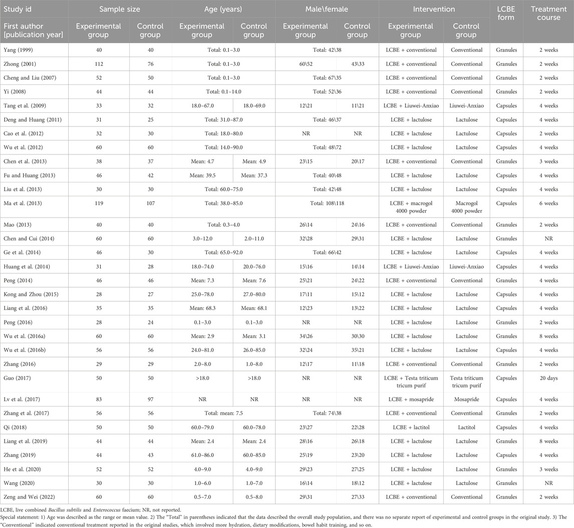 The 32 studies were published between 1999 and 2022, containing 1,565 patients receiving LCBE and control treatment (experimental group) and 1,490 patients receiving control treatment alone (control group). Among these studies, LCBE was delivered in the granule form in 16 studies and the capsule form in the remaining 16 studies. The age of the participants ranged from 0.1 to 92.0 years, while the male percentage ranged from 35.4% to 65.7%; moreover, control treatments included conventional therapy, lactulose, and Liuwei-Anxiao, and the duration of LCBE treatment ranged from 2 to 8 weeks (Table 1).