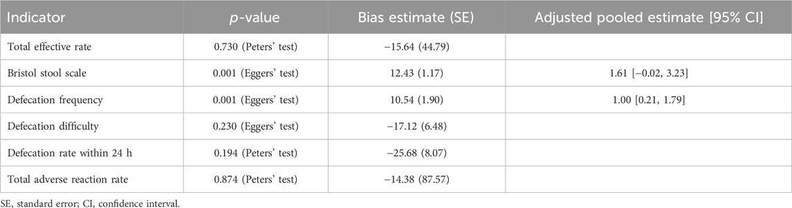 For categorical variables, Peters’ test showed that there was no publication bias in the total effective rate (p = 0.730), the defecation rate within 24 h (p = 0.194), or the total adverse reaction rate (p = 0.874). In terms of continuous variables, Egger’s tests suggested that no publication bias was observed in the defecation difficulty score (p = 0.230). However, there were publication biases in the Bristol Stool Scale score (p = 0.001) and defecation frequency per week (p = 0.001). These publication biases were further adjusted using the trim-and-fill method. For the publication bias in the Bristol Stool Scale score, the adjusted result was different from the unadjusted result, showing that there was no significant difference between groups [SMD (95% CI): 1.61 (−0.02, 3.23)]. Regarding the publication bias in the defecation frequency per week, the adjusted results remained unchanged, revealing a difference between groups [SMD (95% CI): 1.00 (0.21, 1.79)] (Table 2).