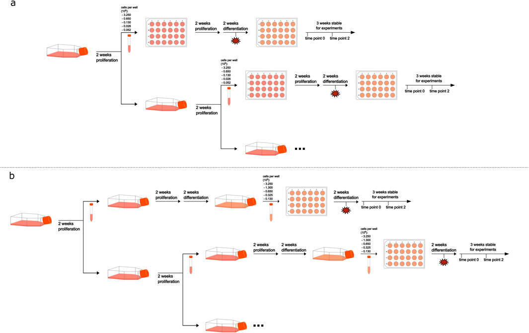 Figure 1. Schematic overview of the cultivation process. Frame (a) represents the normal-density cultivation process and frame (b) the high-density process. Timepoint of cell monolayer damage is indicated by a red star, applied only to half of the samples.