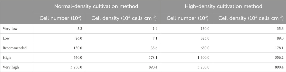 For the high-density cultivation process, cells were passaged into 75 cm2 flasks at a density of 20,000 cells per cm2, where they were kept for 2 weeks in proliferation medium followed by 2 weeks in differentiation medium. Then, cells were harvested using trypsin-EDTA and the cell suspension was centrifuged for 3 min at 500 × g. Afterwards, the supernatant was aspirated and the cell pellet resuspended in differentiation medium. The resuspended cells were passed through autoclaved 250 µm nylon tissue strainers (Fisher Scientific GmbH, Schwerte, Germany), to break down cell clots. Cells were seeded in 12-well plates at different densities (see Table 1) and kept in differentiation medium for another 2 weeks.