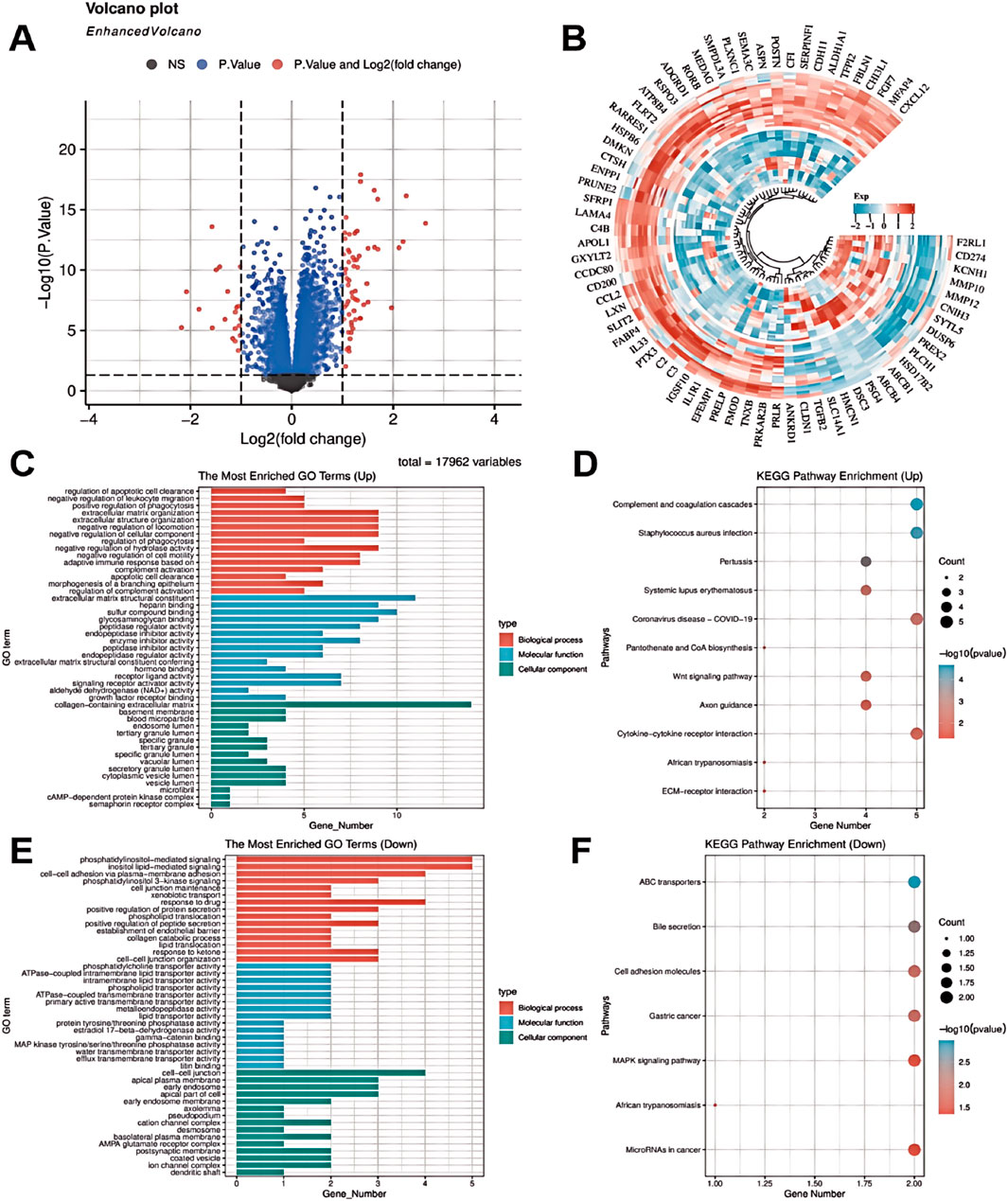 Figure 1. Bioinformatic analysis of GEO datasets was performed to examine differential gene expression and predict KEGG pathway alterations in endometriosis. (A) Volcano plot of differentially expressed genes. (B) Heatmap of differentially expressed genes. (C) GO enrichment analysis of upregulated genes. (D) KEGG pathway enrichment of upregulated genes. (E) GO enrichment analysis of downregulated genes. (F) KEGG pathway enrichment of downregulated genes.
