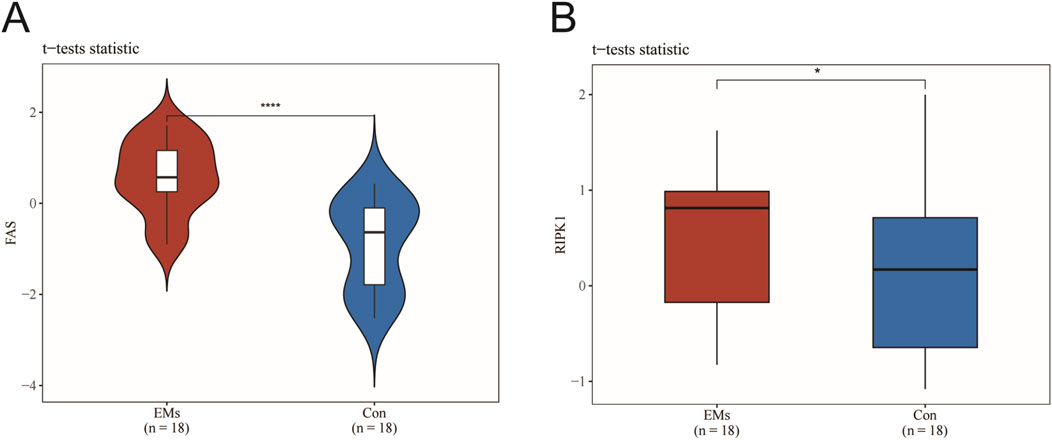 Under normal physiological conditions, Fas and RIPK1 expression facilitates cellular responses to damage and stress by initiating apoptotic or necrotic pathways to eliminate compromised cells. However, in endometriosis (EMs), we observed significantly elevated expression levels of both Fas and RIPK1 compared with normal controls (CON). This aberrant overexpression may promote PANoptosome complex assembly and exacerbate inflammatory responses. Statistical analysis using Student’s t-test revealed highly significant differences in Fas (P < 0.0001) and RIPK1 (P < 0.05) expression between EMs and normal endometrial tissues. These findings suggest that RIPK1 not only plays a pivotal role in PANoptosis regulation but may also serve as a potential therapeutic target for modulating immune evasion and impaired tissue repair mechanisms in EMs pathogenesis (Figures 2A,B).