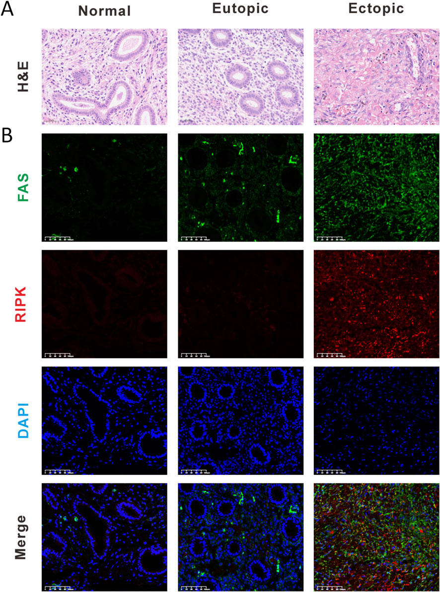 Figure 3. The FAS/RIPK1 signaling axis emerges as a pivotal regulator in endometriosis pathogenesis. (A) Representative H&E staining images (Scale bar = 50 μm). (B) Representative immunofluorescence (Scale bar = 100 μm). (IF) images of normal endometrium (Normal), eutopic endometrium from EMs patients (Eutopic), and ectopic endometrial lesions (Ectopic) (Scale bar = 100 μm).