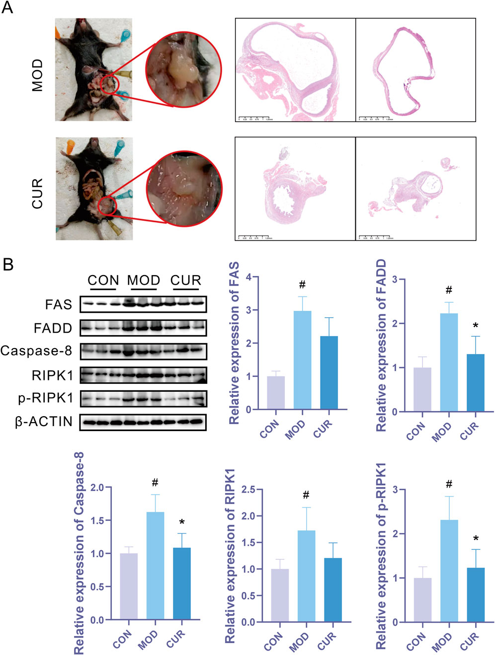 Figure 4. CUR effectively inhibits endometriosis progression by modulating the Fas/FADD/Caspase-8/RIPK1 signaling pathway. (A) Representative macroscopic images of lesions and corresponding H&E-stained histological sections. (B) Western blot analysis of Fas/FADD/Caspase-8/RIPK1 pathway protein expression (n = 3 biological replicates). Data are presented as mean ± SEM. *P < 0.05, **P < 0.01, ***P < 0.001, ****P < 0.0001 vs. the model group. #P < 0.05, ##P < 0.01, ###P < 0.001, ####P < 0.0001 vs. the control group.