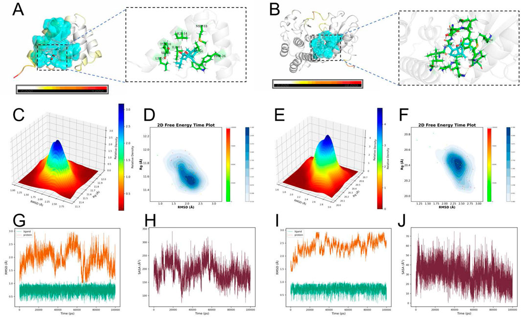 Figure 5. Molecular docking and molecular dynamics (MD) simulations of CUR with FAS and RIPK1. (A) Predicted binding mode of CUR with FAS. (B) Predicted binding mode of CUR with RIPK1. (C) Three-dimensional free energy landscape (FEL) of the FAS–CUR complex. (D) Two-dimensional free energy profile of the FAS–CUR complex over simulation time. (E) Three-dimensional FEL of the RIPK1–CUR complex. (F) Two-dimensional free energy profile of the RIPK1–CUR complex over simulation time. (G) Root-mean-square deviation (RMSD) trajectory of the FAS–CUR complex. (H) Solvent-accessible surface area (SASA) analysis of the FAS–CUR complex. (I) RMSD trajectory of the RIPK1–CUR complex. (J) SASA analysis of the RIPK1–CUR complex. Docking was performed using AutoDock Vina with grid boxes centered at the active sites of FAS (27.5631, 21.5840, 49.9819 Å; 20 × 20 × 20 Å3) and RIPK1 (−13.5856, −7.3611, −20.6319 Å; 20 × 20 × 20 Å3). MD simulations were carried out in GROMACS (100 ns, CHARMM36 force field, TIP3P water, 300 K, 1 atm) to validate the structural stability and thermodynamic properties of the complexes.