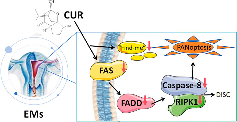 Curcumol (CUR), a primary bioactive terpenoid from Curcuma zedoaria (Ezhu), demonstrates efficacy in EMs animal models by reducing lesion size and inflammation (Lu et al., 2024; Tian et al., 2021b). Which can suppress the JAK2/STAT3 signaling cascade, thereby attenuating inflammatory cytokine production in ectopic endometrial stromal cells. Additionally, they demonstrate potent anti-proliferative and anti-migratory effects, ultimately leading to regression of ectopic lesions (Wang et al., 2022). Recent studies demonstrate that CUR regulates cell death through multiple interconnected mechanisms. It induces tumor cell apoptosis via the IGF-1R and p38 MAPK pathways while concurrently triggering autophagic cell death through JNK signaling activation (Wang et al., 2015; Zhang and Wang, 2017). Furthermore, CUR promotes programmed necrosis by activating Sirt1-mediated Atg5 deacetylation, which enhances protein-protein interactions and stimulates autophagy (Sun et al., 2022). However, the precise mechanisms underlying curcumol’s therapeutic potential in endometriosis (EMs) remain elusive. To address this knowledge gap, our study was designed to investigate two key questions: Whether Fas/RIPK1 co-overexpression occurs in human EMs lesions; Whether CUR can directly engage Fas/RIPK1 to modulate their activity, providing novel therapeutic insights for EMs management.