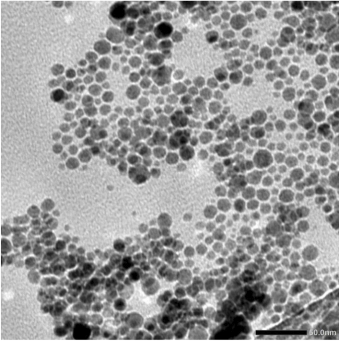 Figure 1. TEM of EGCG-functionalized selenium nanoparticles (SeNPs-EGCG) showing spherical particles with relatively uniform morphology and sizes mostly ranging between 20 and 50 nm.