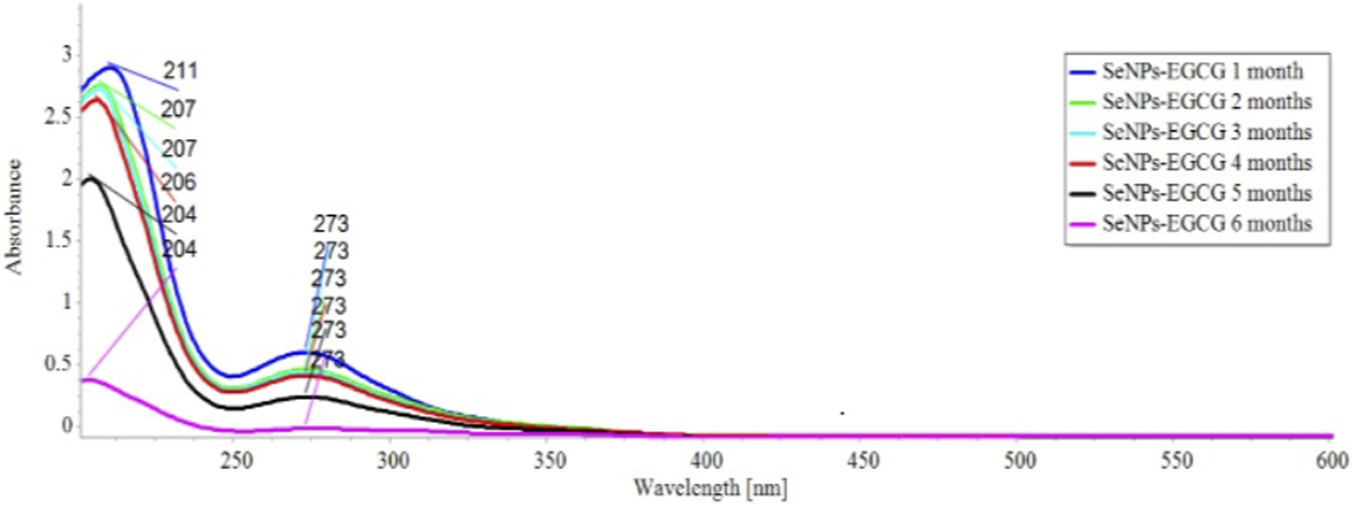 For stability evaluation, UV–Vis spectra were recorded at monthly intervals over a 6-month storage period. The absorption profile remained essentially unchanged, with no detectable shift in peak wavelength or reduction in intensity. This consistent spectral pattern indicates that SeNPs-EGCG preserved their colloidal integrity and physicochemical stability throughout the observation period, underscoring their suitability for extended storage and subsequent experimental applications.