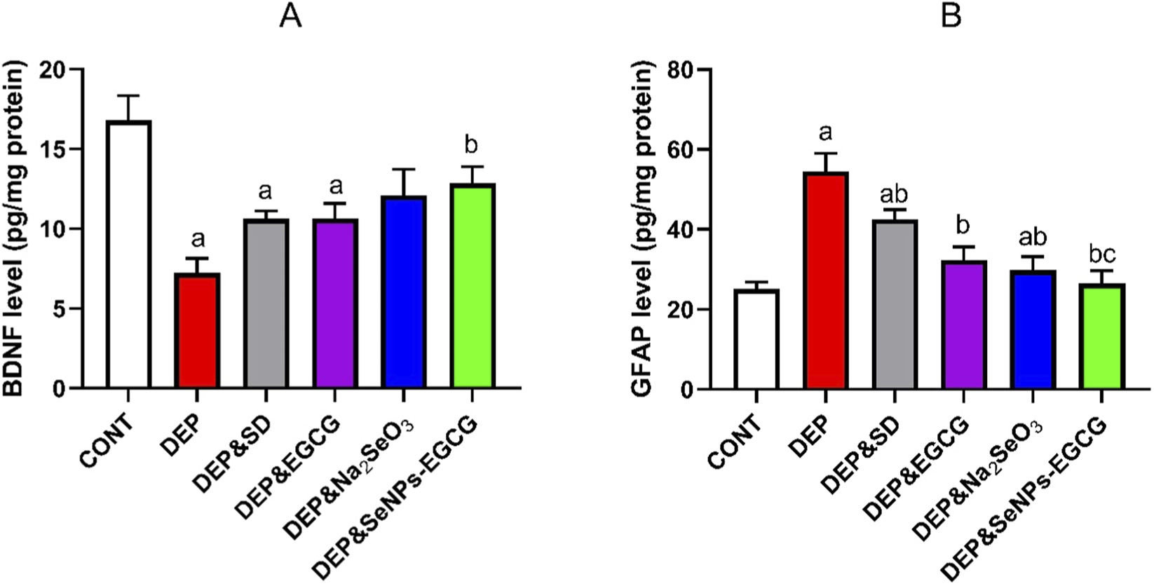 Methods: Six groups of seven rats each were used in a model of depression caused by chronic unpredictable mild stress (CUMS): control, depressed, depressed treated with escitalopram, epigallocatechin gallate (EGCG), sodium selenite (Na2SeO3), and biosynthesised selenium nanoparticles capped with EGCG (SeNPs-EGCG). For 21 days, oral treatments were given. The open field test (OFT) and sucrose preference test (SPT) were used to measure depression-like behaviour. Oxidative stress markers, antioxidant enzymes, inflammatory cytokines, apoptotic proteins, monoamine neurotransmitters, corticosterone, BDNF, GFAP, and histopathological alterations were examined in prefrontal cortex tissue and serum.