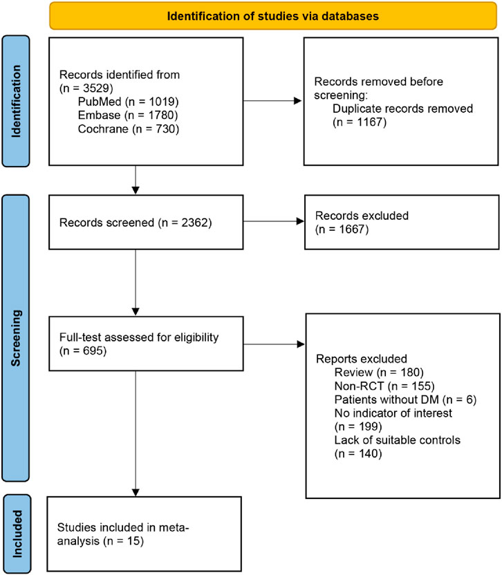 Employing predefined search protocols, PubMed, Embase, and Cochrane Library were systematically searched through integration of Medical Subject Headings (MeSH) and free-text keywords for: (1) diabetes mellitus, (2) bevacizumab, (3) ranibizumab, and (4) aflibercept. The search timeframe spanned from database inception through 2 March 2025, restricted to English-language publications. Full search strategies for individual databases are provided in Supplementary Table S2. Backward citation tracking of systematic reviews (Lees et al., 2023) was conducted to enhance literature identification. Retrieved records were managed using EndNote 20 (Clarivate) to ensure systematic organization.