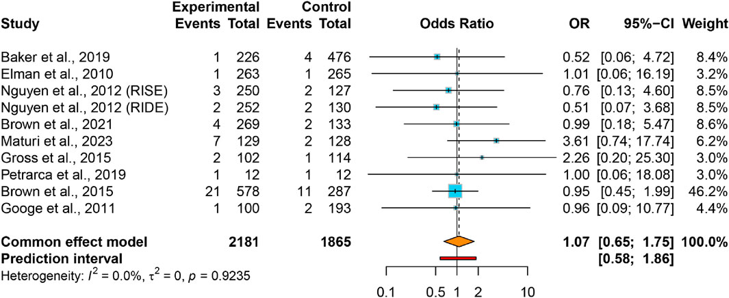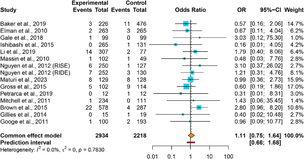 This study adopted a frequentist meta-analytic framework. Eligible studies that reported dichotomous outcomes were synthesized using the meta package in R software (version 4.3.2). Overall effects were evaluated using a z-test, with odds ratios (OR) and 95% confidence intervals (95% CI) as effect measures. To determine the probable range of the true effect in an individual setting, we calculated 95% prediction intervals (95% PIs) (IntHout et al., 2016). Heterogeneity was assessed using I2 and τ2 (τ2 estimated by restricted maximum likelihood, REML), with I2 ≥ 50% indicating substantial heterogeneity (Higgins et al., 2003). We prespecified a fixed-effects model when I2 < 50% and a random-effects model otherwise. Continuity corrections of 0.5 were used to include zero total event trials (Yerubandi et al., 2024).