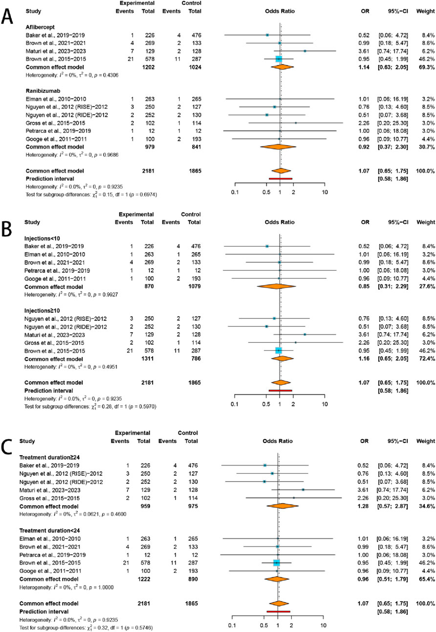 Figure 3. Subgroup analysis of the ORs for (A) VEGFis types, (B) injection numbers, and (C) treatment duration comparing VEGFis groups with control groups.