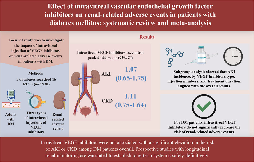 Against this background, RCTs of intravitreal VEGFis mainly focus on ocular efficacy and safety, with limited data on their systemic effects, especially renal safety in patients with DM. While prior meta-analyses have explored renal-related adverse events (AEs), our study offers new insights by systematically evaluating a wide range of specific renal-related AEs in DM patients only (Huang et al., 2025; Lees et al., 2023). To address the lack of evidence on the renal effects of intravitreal VEGFis in DM, we conducted a systematic review and meta-analysis of RCTs.