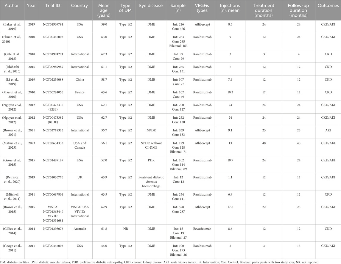 Through a systematic search of 3,529 articles, we identified 15 eligible full-text articles reporting 16 trials (Baker et al., 2019; Elman et al., 2010; Gale et al., 2018; Ishibashi et al., 2015; Li et al., 2019; Massin et al., 2010; Nguyen et al., 2012; Brown et al., 2021; Maturi et al., 2023; Gross et al., 2015; Petrarca et al., 2020; Mitchell et al., 2011; Brown et al., 2015; Gillies et al., 2014; Googe et al., 2011), with 5,930 participants (Figure 1). The mean age ranged from 52.0 to 63.9 years (Table 1). Ethnicity was recorded in 81.3% of studies. The evaluation of risk of bias across all included studies is presented in Supplementary Figure S1.