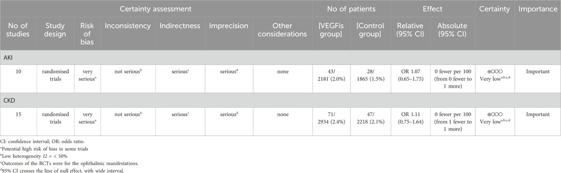 This meta-analysis of 16 RCTs (5,930 patients with DM) found no significant increase in AKI or CKD with intravitreal VEGFis versus controls, with low between-study heterogeneity. Subgroup analyses by agent (aflibercept vs. ranibizumab), injection numbers (≥10 vs. < 10), and treatment duration (≥24 vs. < 24 months) showed no difference in AKI. Meta-regression by agent, injection numbers, treatment duration, and follow-up likewise showed no association with renal risks. According to GRADE (Table 2), the certainty of evidence for AKI and CKD was very low due to risk of bias, indirectness, and imprecision; therefore, the results should be interpreted with caution.