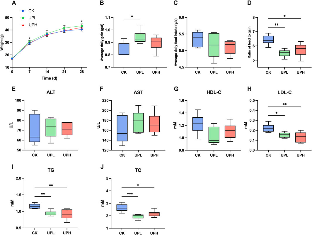 A set of graphs showing various health metrics across three groups: CK, UPL, and UPH. Panel A displays a line graph of weight over time, showing an upward trend. Panels B, C, and D are box plots of average daily gain, feed intake, and feed-to-gain ratio, with significant differences marked by asterisks. Panels E and F show ALT and AST enzyme levels, respectively. Panels G, H, I, and J display HDL-C, LDL-C, TG, and TC levels, respectively, also indicating statistical significance through asterisks. The y-axis units vary, highlighting changes across the groups.