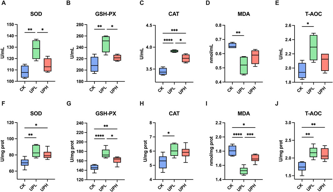 Figure 2. Effects of Urtica cannabina polysaccharide (UP) supplementation on serum (A–D) and liver (F–J) antioxidative activities (n = 6). *P < 0.05, **P < 0.01, ***P < 0.001, and ****P < 0.0001 CK, control; UPL, low dose of U. cannabina polysaccharide; UPH, high dose of U. cannabina polysaccharide; SOD, superoxide dismutase; GSH-PX, glutathione peroxidase; CAT, catalase; MDA, malondialdehyde; T-AOC, total antioxidant capacity.