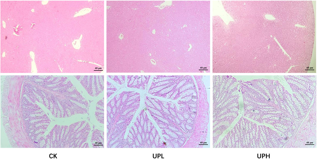 Figure 3. Effects of Urtica cannabina polysaccharide (UP) supplementation on the histological structure of liver and colon (n = 4). Representative images were captured by a microscope at 40×. CK, control; UPL, low dose of U. cannabina polysaccharide; UPH, high dose of U. cannabina polysaccharide.