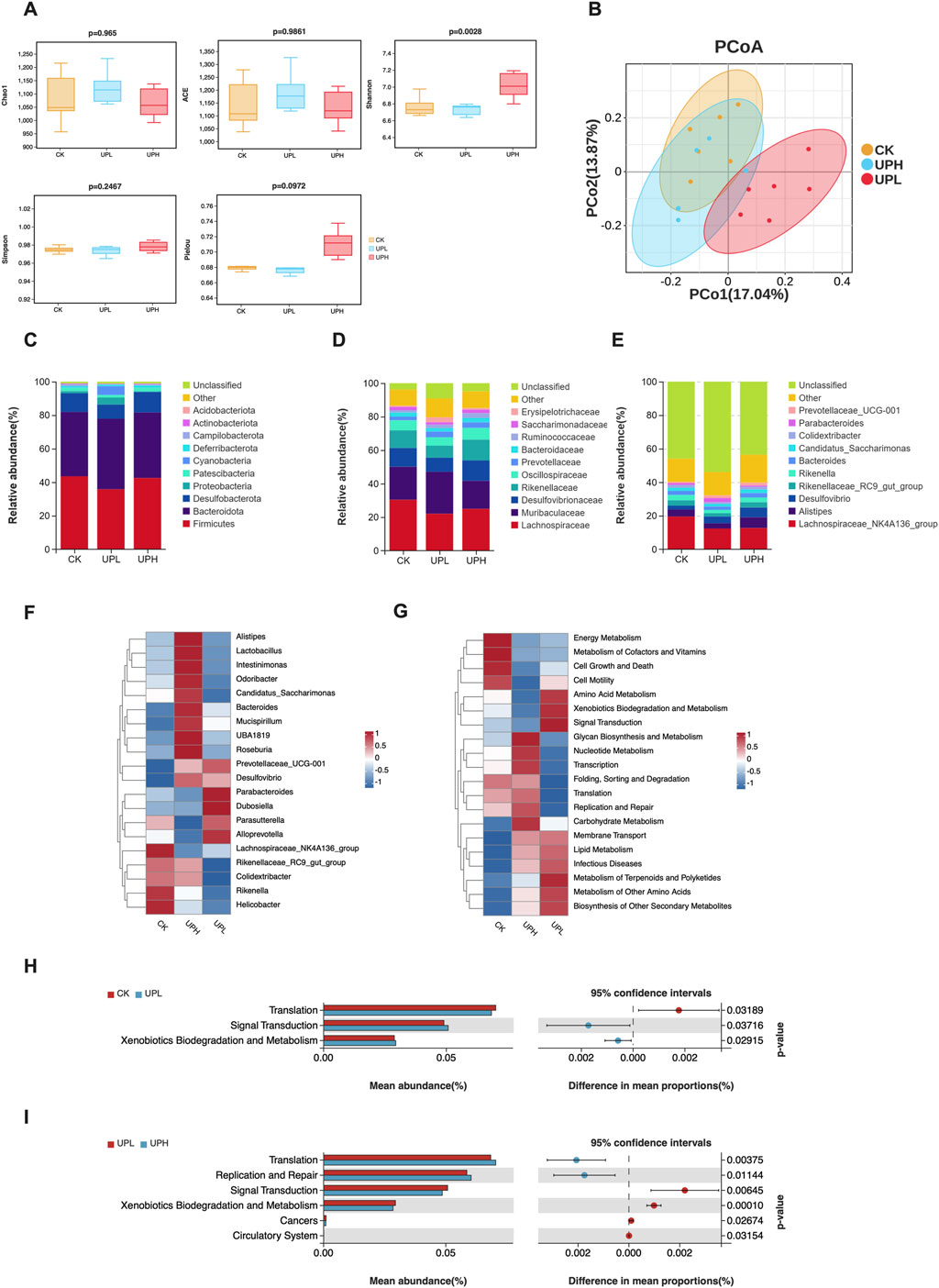 Multi-panel scientific figure displaying microbiome data. Panel A features box plots showing metrics like Chao1 and PD index across CK, UPL, and UPH groups, with p-values indicated. Panel B presents a PCoA plot with color-coded ellipses for each group. Panels C, D, and E show stacked bar charts of relative bacterial abundance at different taxonomic levels. Panels F and G display heatmaps for microbial and metabolic pathways, respectively. Panels H and I provide bar charts comparing mean abundance and differences in proportions for functional categories between groups with confidence intervals.