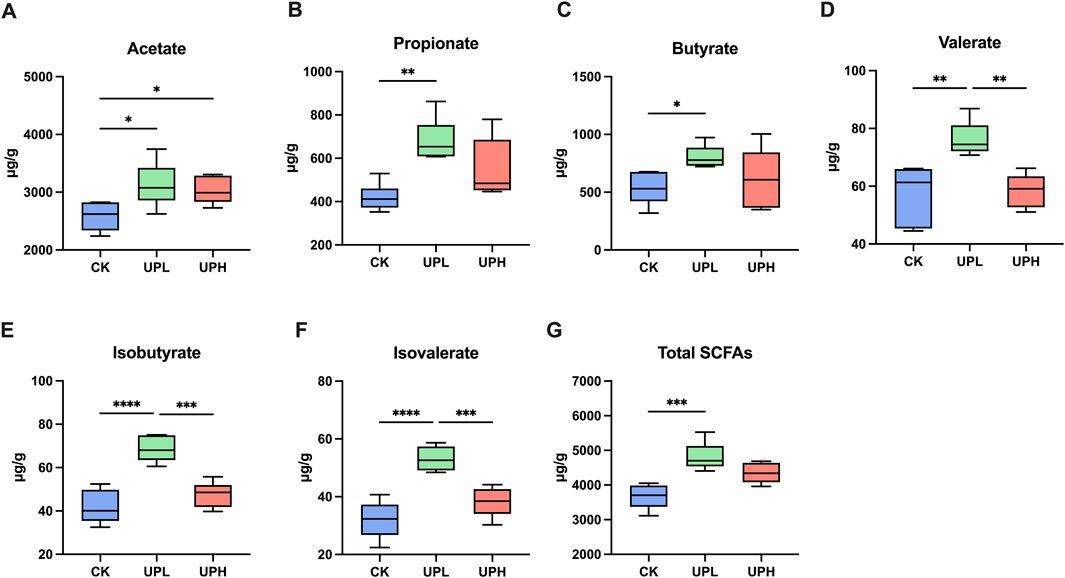 Figure 5. Effects of Urtica cannabina polysaccharide (UP) supplementation on the short-chain fatty acids (SCFAs) (A-G) concentrations of colon contents. Data are presented as means ± SD (n = 6). *P < 0.05, **P < 0.01, ***P < 0.001, and ****P < 0.0001. CK, control; UPL, low dose of U. cannabina polysaccharide; UPH, high dose of U. cannabina polysaccharide.