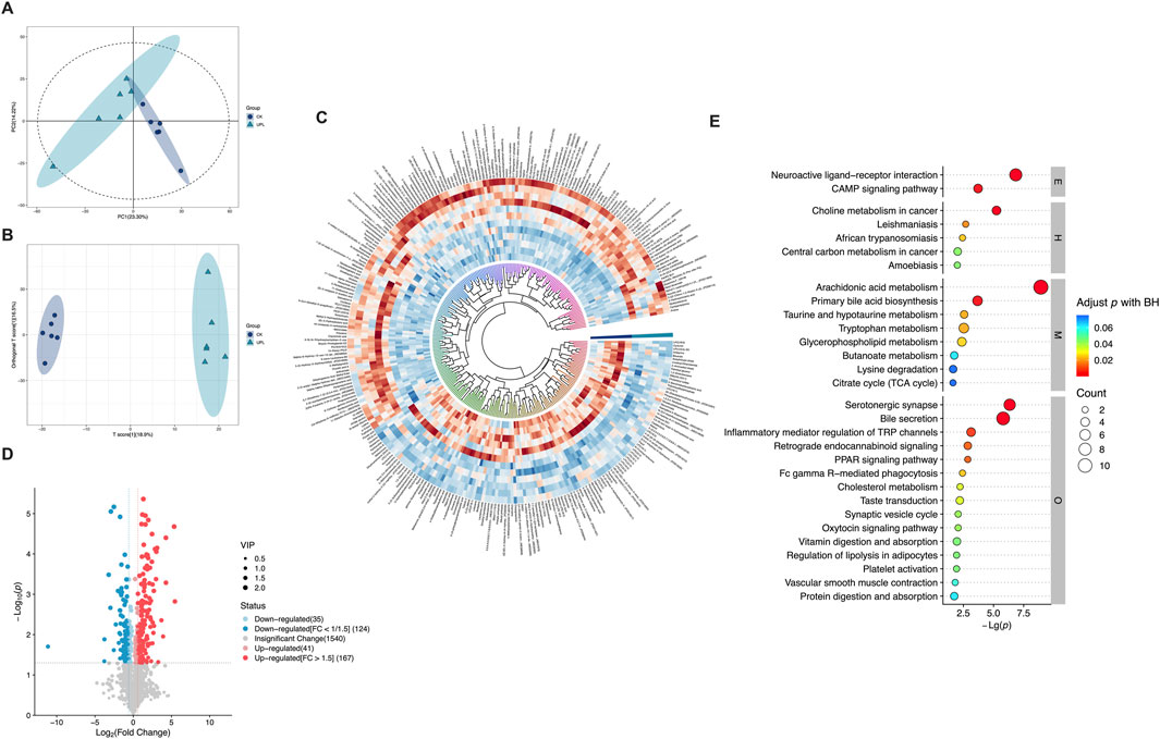 Figure 6. Comprehensive analysis of untargeted serum metabolomics of mice in the CK (n = 6) and UPL (n = 6) groups. (A,B) PCA (A) and OPLS-DA plots of metabolomics data. (C) Classification and expression changes of differential metabolites in two groups by circle heatmap. (D) Volcano map of metabolites. Horizontal axis represents logarithm of the relative content fold change: Log2(Fold Change). Vertical axis represents level of significant difference: Log10 P-value; size of the dot represents VIP value. (E) Top 30 enriched KEGG pathways (level 1) of differentially expressed metabolites. Horizontal axis represents level of significant difference: log10 P-value; size of the dot represents number of metabolites. CK, control; UPL, low dose of Urtica cannabina polysaccharide; E, environmental information processing; H, human diseases; M, metabolism; O, organismal systems.