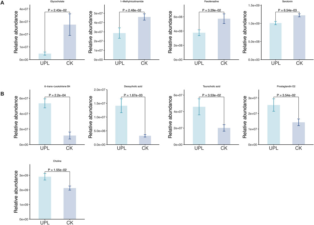 Bar graphs show the relative abundance of various compounds in two groups: UPL and CK. Panel A includes glycocolate, 1-methylnicotinamide, fexofenadine, and serotonin. Panel B includes 6-trans-leukotriene B4, deoxycholic acid, taurocholic acid, prostaglandin E2, and choline. Each graph shows error bars and p-values indicating statistical significance. The UPL group generally displays higher relative abundance than the CK group.