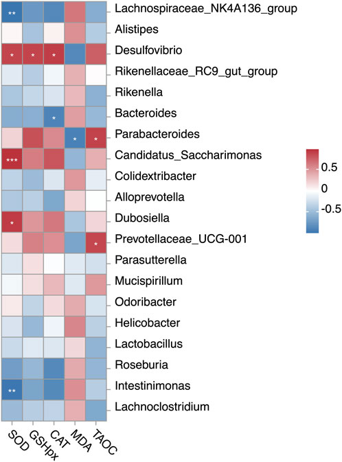 Figure 8. Correlation between the relative abundances of gut bacteria and hepatic antioxidant indexes. Pearson’s correlation coefficients (r) are given, with r < 0 indicating negative correlation (blue), r = 0 indicating no correlation (white), and r > 0 indicating positive correlation (red). “*”, “**”, and “***” indicate significance level at 0.05, 0.01 and 0.001, respectively. SOD, superoxide dismutase; GSH-PX, glutathione peroxidase; CAT, catalase; MDA, malondialdehyde; T-AOC, total antioxidant capacity.