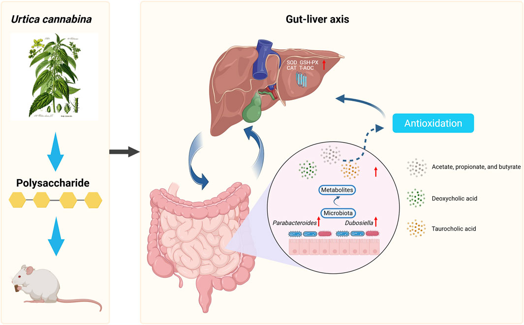 Diagram illustrating the effect of Urtica cannabina polysaccharide on the gut-liver axis. The left section shows Urtica cannabina and polysaccharide with a mouse, indicating intake. The central section features the intestines, with labeled microbiota and metabolites, including Parabacteroides and Dubosiella. The right section shows the liver and highlights antioxidation processes with metabolites like acetate and deoxycholic acid. Arrows indicate the interaction between the gut and liver.