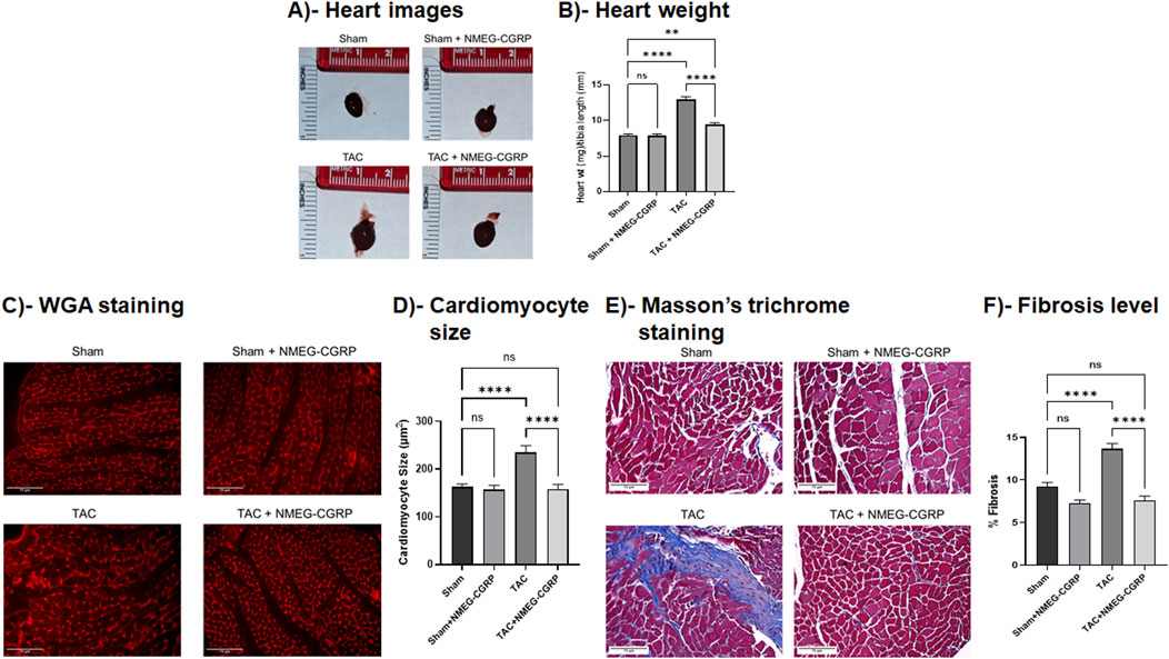 Figure 4. NMEG-CGRP reduced cardiac hypertrophy and fibrosis in the TAC mice. (A) Representative heart images from all four groups of mice. (B) The ratio of wet heart wt and tibia length was calculated and plotted. **p = 0.0039 and ****p < 0.0001, ns = non-significant. (C) Fluorescence images showing WGA staining in the LVs. Scale bar = 75 µm. The cross-sectional area of cardiomyocytes was measured and plotted (D). ****p < 0.0001, ns = non-significant. (E) Masson’s trichrome stained images showing collagen content in the LVs. Scale bar = 75 µm. The % fibrosis was calculated and plotted (F). ****p < 0.0001, ns, non-significant.